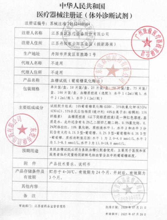 魚躍血糖試紙(葡萄糖氧化酶法)必須與魚躍血糖儀配套使用,主要用于醫(yī)院和家庭患者體外定量檢測新鮮毛細血管全血中的葡萄糖濃度。與魚躍血糖儀305(305A、305B)配套使用。請確認單片試紙上校正碼與屏幕顯示相同。