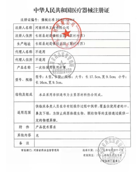一次性使用醫(yī)用口罩(祥禾)采用非織造布為主要原材料熱合而成。供臨床各類人員在非有創(chuàng)操作過程中佩帶,覆蓋住使用者的口、鼻及下頜,為防止病原體微生物、顆粒物等的直接透過提供一定的物理屏障。