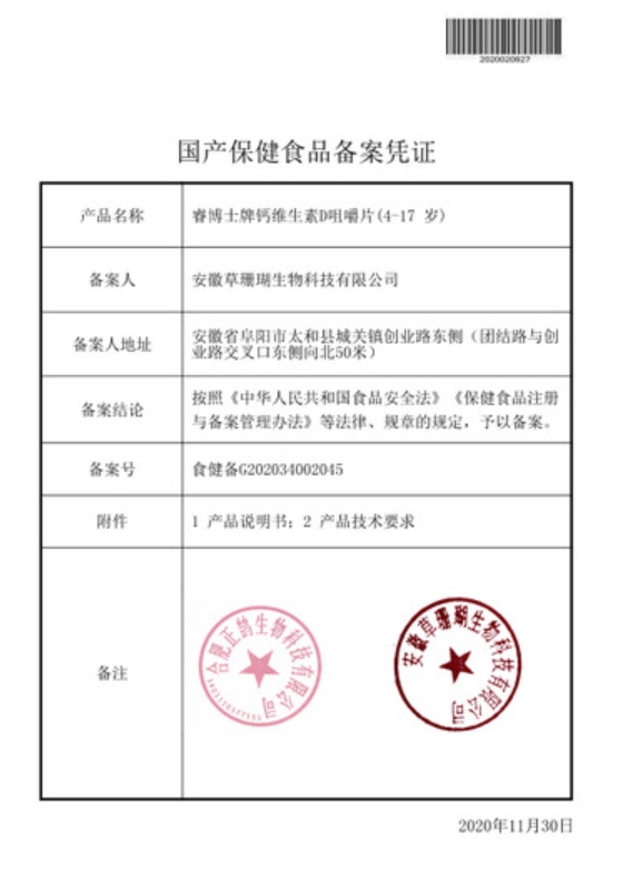 睿博士牌鈣維生素D咀嚼片(蓋動力)保健功能:補充鈣、維生素D;適宜人群:需要補充鈣、維生素D3的4-17歲人群;不適宜人群:3歲以下人群及成人、孕婦、乳母。每日1次,每次2片,食用方法:嚼食。