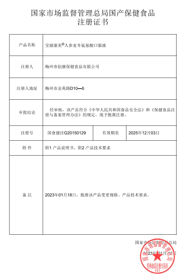 寶麗康美®人參麥冬氨基酸口服液保健功能:本品經(jīng)動(dòng)物實(shí)驗(yàn)評價(jià),具有增強(qiáng)免疫力的保健功能;適宜人群:免疫力低下者;不適宜人群:少年兒童、孕婦、乳母。每日2次,每次10mL,口服。本品不能代替藥物;適宜人群外的人群不推薦食用本產(chǎn)品。
