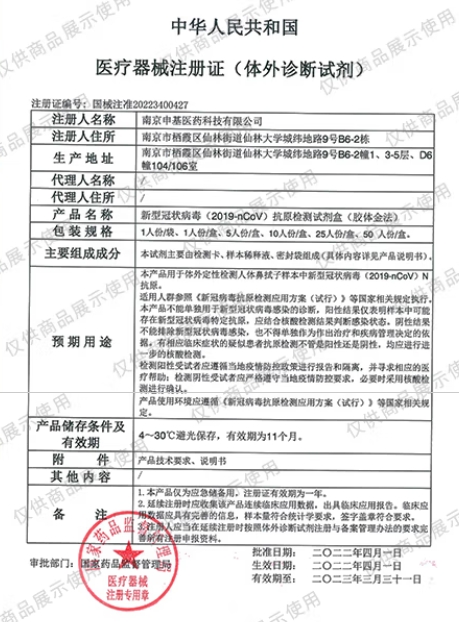 適用范圍:本產(chǎn)品用于體外定性檢測(cè)人體鼻拭子樣本中新型冠狀病毒(2019-nCoV)N抗原。適用人群參照《新冠病毒抗原檢測(cè)應(yīng)用方案(試行)》等國(guó)家相關(guān)規(guī)定執(zhí)行。本產(chǎn)品不能單獨(dú)用于新型冠狀病毒感染的診斷,陽(yáng)性結(jié)果僅表明樣本中可能存在新型冠狀病毒特定抗原,應(yīng)結(jié)合核酸檢測(cè)結(jié)果判斷感染狀態(tài)。陰性結(jié)果不能排除新型冠狀病毒感染,也不得單獨(dú)作為作出治療和疾病管理決定的依據(jù)。有相應(yīng)臨床癥狀的疑似患者抗原檢測(cè)不管是陽(yáng)性還是陰性,均應(yīng)進(jìn)行進(jìn)一步的核酸檢測(cè)。檢測(cè)陽(yáng)性受試者應(yīng)遵循當(dāng)?shù)匾咔榉揽卣哌M(jìn)行報(bào)告和隔離,并尋求相應(yīng)的醫(yī)療幫助;檢測(cè)陰性受試者應(yīng)嚴(yán)格遵守當(dāng)?shù)匾咔榉揽匾?,必要時(shí)采用核酸檢測(cè)進(jìn)行確認(rèn)。產(chǎn)品使用環(huán)境應(yīng)遵循《新冠病毒抗原檢測(cè)應(yīng)用方案(試行)》等國(guó)家相關(guān)規(guī)定。