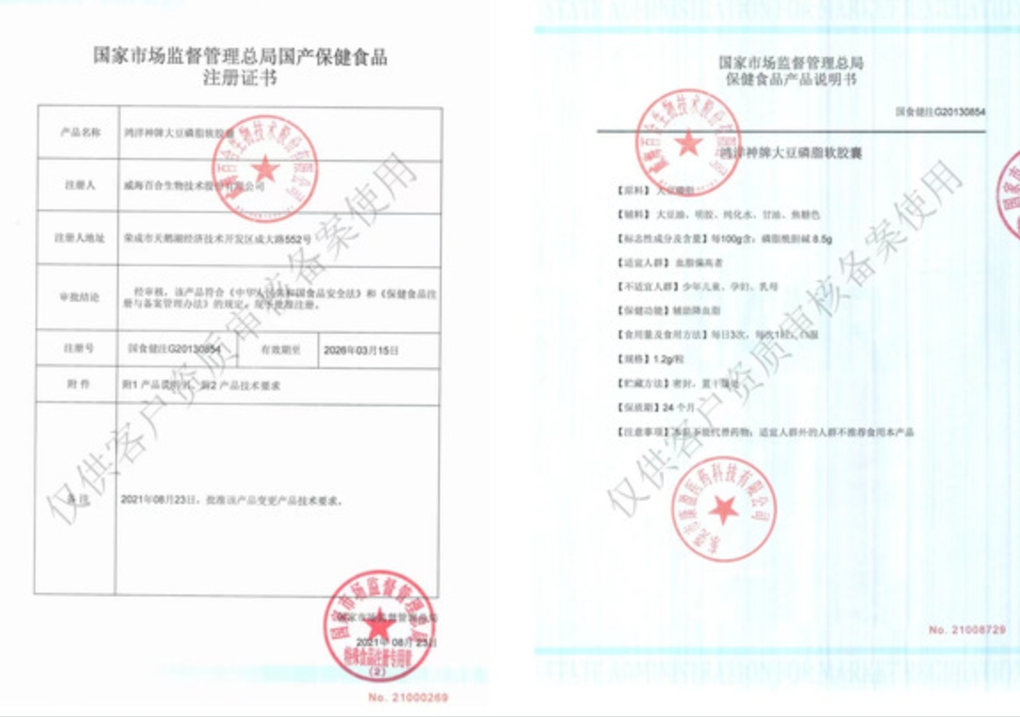 BIOHEK鴻洋神牌大豆磷脂軟膠囊保健功能:輔助降血脂;適宜人群:血脂偏高者;不適宜人群:少年兒童、孕婦、乳母。原料:大豆磷脂;輔料:大豆油、明膠、純化水、甘油、焦糖色;每100g含:磷脂酰膽堿8.5g。