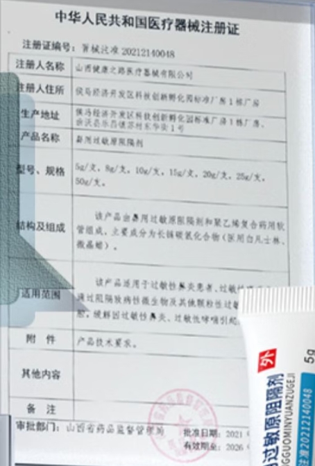 的修正鼻用過敏原阻隔劑由鼻用過敏原阻隔劑和聚乙烯復(fù)合藥用軟管組成,主要成分為長鏈碳?xì)浠衔铮ㄡt(yī)用白凡士林、微晶蠟)。該產(chǎn)品適用于過敏性鼻炎患者、過敏性哮喘患者,通過阻隔致病性微生物及其他顆粒性過敏物質(zhì)進(jìn)入鼻腔,緩解因過敏性鼻炎、過敏性哮喘引起的相關(guān)癥狀。