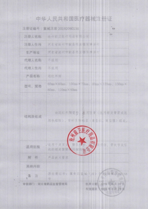 筋骨百痛消遠(yuǎn)紅外貼適用于肩周炎、腰肌勞損、軟組織損傷、骨關(guān)節(jié)炎引起的頸肩腰腿痛的輔助治療。清潔患處:打開包裝,掲去背襯,將膏面貼敷于疼痛部位皮膚即可,12-24小時(shí)更換一次,7天為一療程。療程間隔5天可繼續(xù)使用。