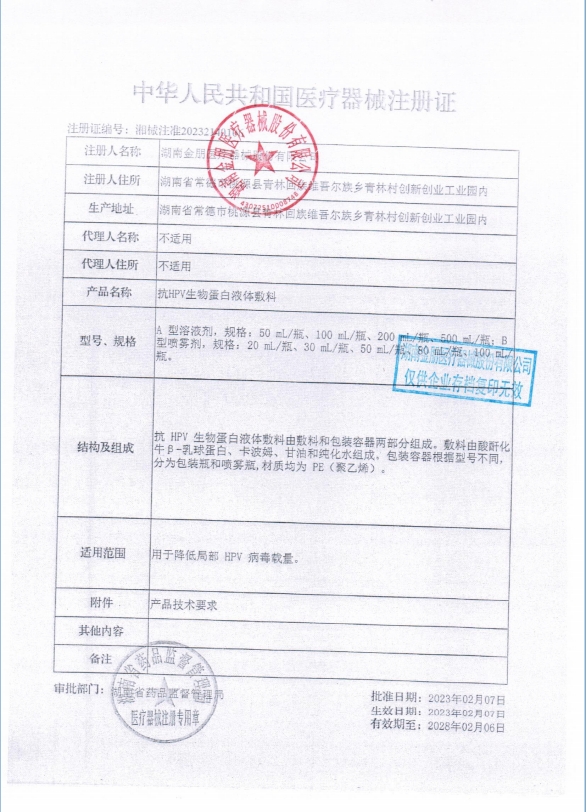 金朋抗HPV生物蛋白液體敷料由敷料和包裝容器兩部分組成。敷料由酸酐化牛β-乳球蛋白、卡波姆、甘油和純化水組成。用于降低局部HPV病毒載量。
