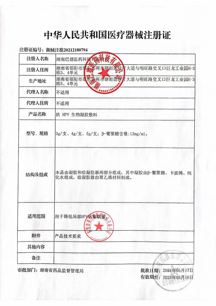俏安婷抗HPV生物凝膠敷料由凝膠和給凝膠器兩部分組成,其中凝膠由β-葡聚糖、卡波姆、純化水組成,給凝膠器由聚乙烯材料制成。用于降低局部HPV病毒載量。