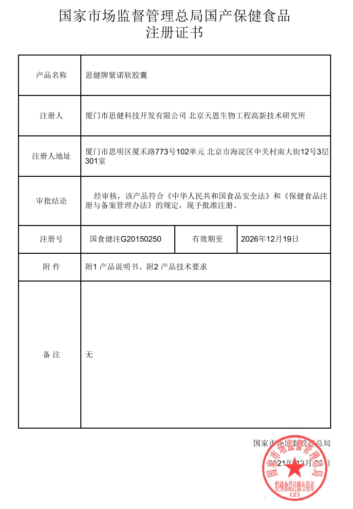 思健牌紫諾軟膠囊保健功能:輔助降血脂、抗氧化;適宜人群:血脂偏高者、中老年人;不適宜人群:少年兒童、孕婦、乳母。每日3次,每次2粒,口服。本品不能代替藥物。適宜人群外的人群不推薦食用本產(chǎn)品。蜂產(chǎn)品過敏者慎用。