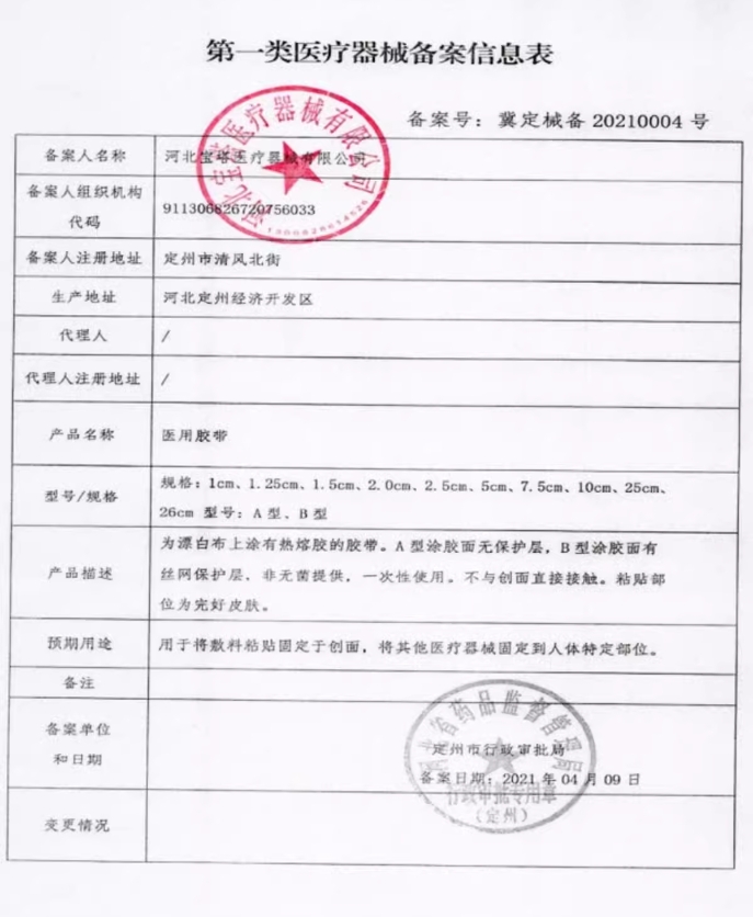 醫(yī)用膠帶(寶塔)為漂白布上涂有熱熔膠的膠帶。A型涂膠面無保護(hù)層,B型涂膠面有絲網(wǎng)保護(hù)層,非無菌提供,一次性使用。不與創(chuàng)面直接接觸。粘貼部位為完好皮膚。用于將敷料粘貼固定于創(chuàng)面,將其他醫(yī)療器械固定到人體特定部位。