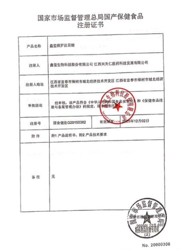鑫璽牌羅漢果糖(羅氏貝特)保健功能:清咽;適宜人群:咽部不適者;不適宜人群:嬰幼兒、孕婦、乳母。每日5次,每次1片,含服。