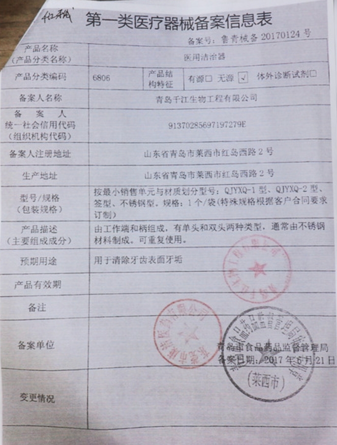 千江牙線簽醫(yī)用潔治器由工作端和柄組成,有單頭和雙頭兩種類型,通常由不銹鋼材料制成??芍貜褪褂?。用于清除牙齒表面牙垢。將本產(chǎn)品放在牙齒與牙齒間的縫中慢慢地前后移動,使其穿入牙縫間將齒垢清除。產(chǎn)品尾端可當牙簽使用。