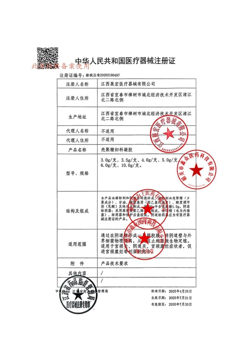 健嶺殼聚糖婦科凝膠由凝膠劑和陰道給藥器組成。凝膠劑由殼聚糖(主要成分)、甘油、凝膠基質(zhì)(羥乙基纖維素)、酸度調(diào)節(jié)劑(乳酸)及純化水制成,每100g中含殼聚糖1.0g。陰道給藥器:采用高密度聚乙烯材質(zhì)制成,由頂帽(也為內(nèi)推塞)、給藥器和保護(hù)后蓋組成。陰道給藥器應(yīng)為有醫(yī)療器械注冊(cè)證的產(chǎn)品。