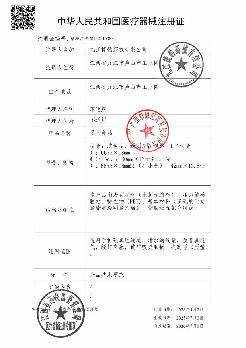 苗力邦通氣鼻貼由表面材料(水刺無紡布)、壓力敏感膠粘、彈性物(PET)、基本材料(多孔的無紡聚酯或透明聚乙烯)、背貼紙五部分組成。適用于擴(kuò)張鼻腔通道,增加通氣量,改善鼻通氣,緩解鼻塞,使呼吸更順暢,提高睡眠質(zhì)量。