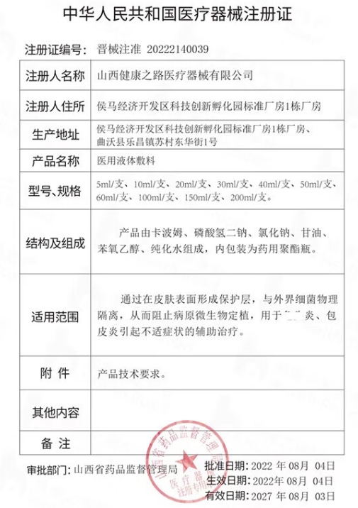 葵花醫(yī)用液體敷料由卡波姆、磷酸氫二鈉、氯化鈉、甘油、苯氧乙醇、純化水組成,內(nèi)包裝為藥用聚酯瓶。通過(guò)在皮膚表面形成保護(hù)層,與外界細(xì)菌物理隔離,從而阻止病原微生物定植,用于龜頭炎、包皮炎引起不適癥狀的輔助治療。
