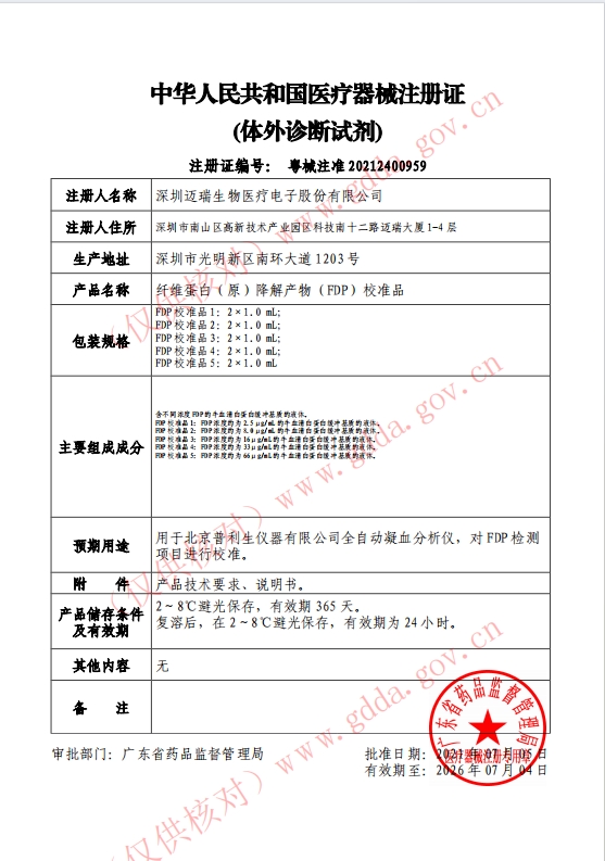 適用范圍:纖維蛋白(原)降解產物(FDP)校準品用于北京邁瑞醫(yī)療器械有限公司和深圳邁瑞生物醫(yī)療電子股份有限公司全自動凝血分析儀,對FDP檢測項目進行校準。