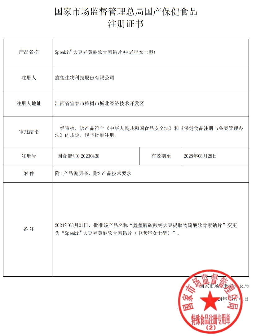 Speakin®大豆異黃酮軟骨素鈣片(中老年女士型)的保健功能:本品經(jīng)動(dòng)物實(shí)驗(yàn)評(píng)價(jià),具有有助于改善骨密度的保健功能;適宜人群:中老年女性;不適宜人群:少年兒童、孕婦、乳母、婦科腫瘤患者、有婦科腫瘤家族病史者。每日1次,每次1片,口服。本品不能代替藥物。