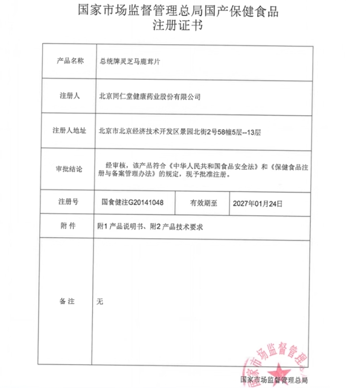總統(tǒng)牌靈芝馬鹿茸片保健功能:本品經動物實驗評價,具有增強免疫力、緩解體力疲勞的保健功能;適宜人群:免疫力低下者、易疲勞者;不適宜人群:少年兒童、孕婦、乳母。每日2次,每次2片,口服。本品不能代替藥物。適宜人群外的人群不推薦食用本產品。