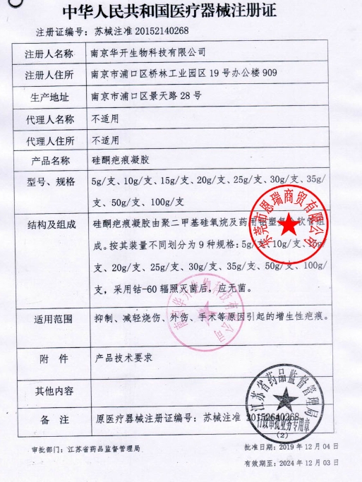 華開硅酮疤痕凝膠由聚二甲基硅氧烷及藥用鋁塑復(fù)合軟管組成。采用鈷-60輻照滅菌后,應(yīng)無菌。抑制、減輕燒傷、外傷、手術(shù)等原因引起的增生性疤痕。本品僅供外用,傷口愈合后方可使用,不可口服。每次使用前清潔使用部位皮膚表面,破損處嚴(yán)禁使用。