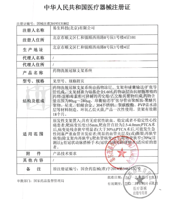 注冊證號:國械注準(zhǔn)20193131802批件 生產(chǎn)廠家:易生科技(北京)有限公司