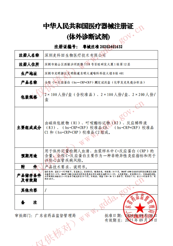 注冊證號:粵械注準(zhǔn)20202401632批件 生產(chǎn)廠家:深圳麥科田生物醫(yī)療技術(shù)股份有限公司