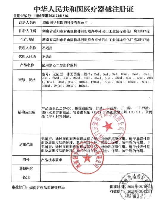 修正醫(yī)用聚乙二醇潤護(hù)敷料由聚乙二醇400、橄欖油酸酯、甘油、卡波姆、丁二醇、三乙醇胺、純化水和容器組成,容器由聚酯(PET)、高密度聚乙烯(HDPE)、聚丙烯(PP)材料制成。無菌型:通過在創(chuàng)面表面形成保護(hù)層,起物理屏障作用。用于非慢性創(chuàng)面及周圍皮膚的護(hù)理。具有創(chuàng)面保護(hù)、潤滑、保濕、防干裂的作用。