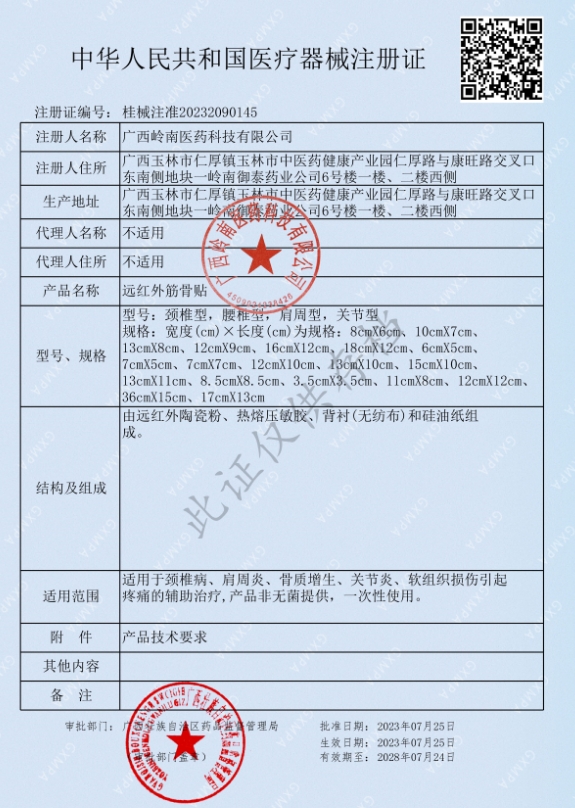 五步蛇遠(yuǎn)紅外筋骨貼由遠(yuǎn)紅外陶瓷粉、熱熔壓敏膠、背襯(無紡布)和硅油紙組成。適用于頸椎病、肩周炎、骨質(zhì)增生、關(guān)節(jié)炎、軟組織損傷引起疼痛的輔助治療,產(chǎn)品非無菌提供,一次性使用。將皮膚清潔后,揭去本品下方硅油紙,將膏面貼于痛患處的皮膚上,每天1次,一次一貼。