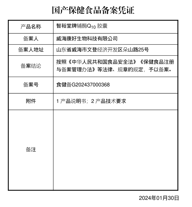 智裕堂牌輔酶Q10膠囊(京都頤正堂/華北制藥)保健功能:有助于增強免疫力和有助于抗氧化;適宜人群:成人;不適宜人群:少年兒童、孕婦、乳母、過敏體質(zhì)人群。每日1次,每次1粒,食用方法:口服。本品不能代替藥物。