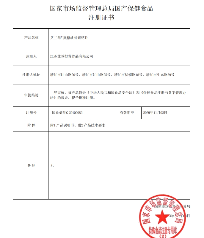 阿斯尤安艾蘭得氨糖軟骨素鈣片保健功能:本品經(jīng)動(dòng)物實(shí)驗(yàn)評(píng)價(jià),具有增加骨密度的保健功能;適宜人群:中老年人;不適宜人群:少年兒童、孕婦、乳母。每日3次,每次2片;吞食。