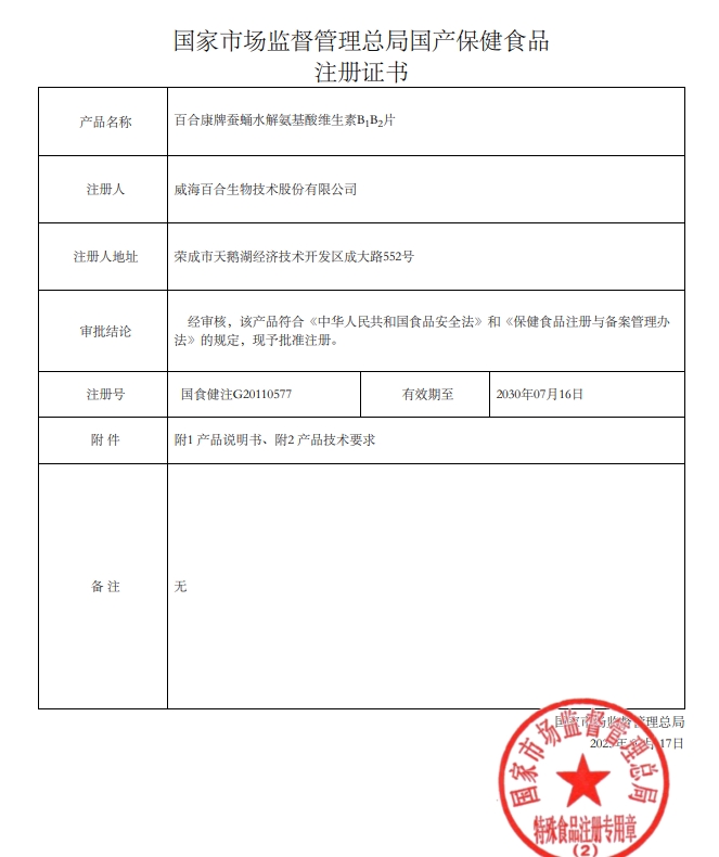 華北制藥百合康牌復(fù)合氨基酸維生素B1維生素B2片保健功能:本品經(jīng)動物實驗評價,具有增強免疫力的保健功能;適宜人群:免疫力低下者;不適宜人群:少年兒童、孕婦、乳母。每日2次,每次2片,口服。本品不能代替藥物。適宜人群外的人群不推薦食用本產(chǎn)品。