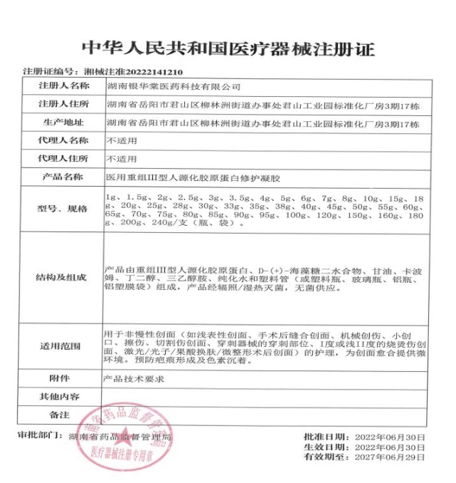 澀岡醫(yī)用重組Ⅲ型人源化膠原蛋白修護(hù)凝膠用于非慢性創(chuàng)面(如淺表性創(chuàng)面、手術(shù)后縫合創(chuàng)面、機(jī)械創(chuàng)傷、小創(chuàng)口、擦傷、切割傷創(chuàng)面、穿刺器械的穿刺部位、I度或淺II度的燒燙傷創(chuàng)面、激光/光子/果酸換膚/微整形術(shù)后創(chuàng)面)的護(hù)理,為創(chuàng)面愈合提供微環(huán)境。預(yù)防疤痕形成及色素沉著。
