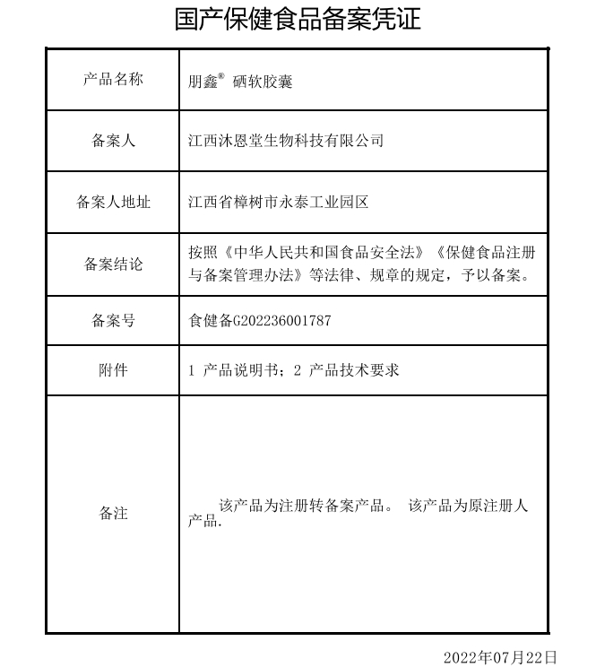 朋鑫硒軟膠囊保健功能:補(bǔ)充硒;適宜人群:需要補(bǔ)充硒的4-17歲人群及成人、孕婦、乳母;不適宜人群:3歲以下人群。每日1次,每次1粒;食用方法:直接吞服。本品不能代替藥物。適宜人群外的人群不推薦食用本產(chǎn)品。不宜超過推薦量或與同類營養(yǎng)素同時食用。高硒地區(qū)人群不宜食用。