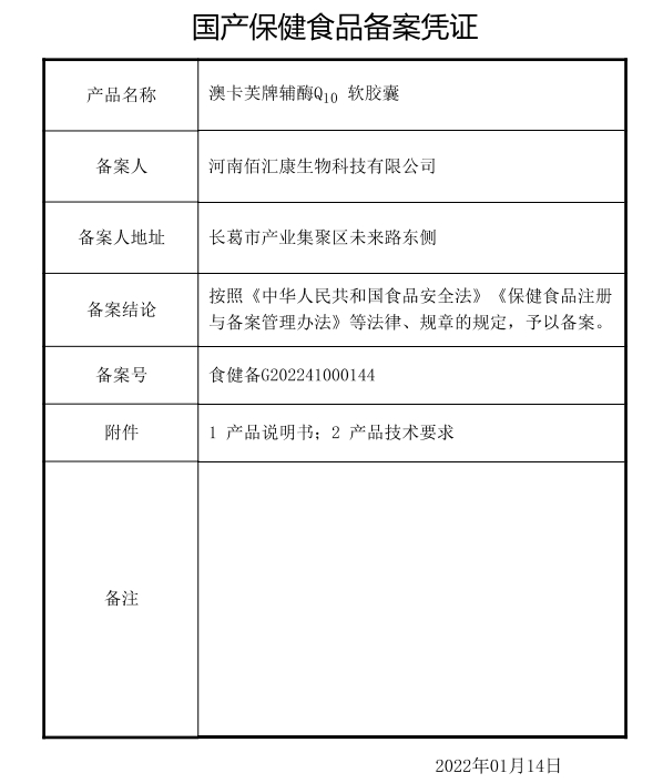 盛力源澳卡芙牌輔酶Q10軟膠囊保健功能:增強(qiáng)免疫力和抗氧化;適宜人群:成人;不適宜人群:少年兒童、孕婦、乳母、過(guò)敏體質(zhì)人群。每日1次,每次1粒,食用方法:口服,飯后溫開(kāi)水送服。本品不能代替藥物。適宜人群外的人群不推薦食用本產(chǎn)品。服用治療藥物的人群食用本品時(shí)應(yīng)向醫(yī)生咨詢。