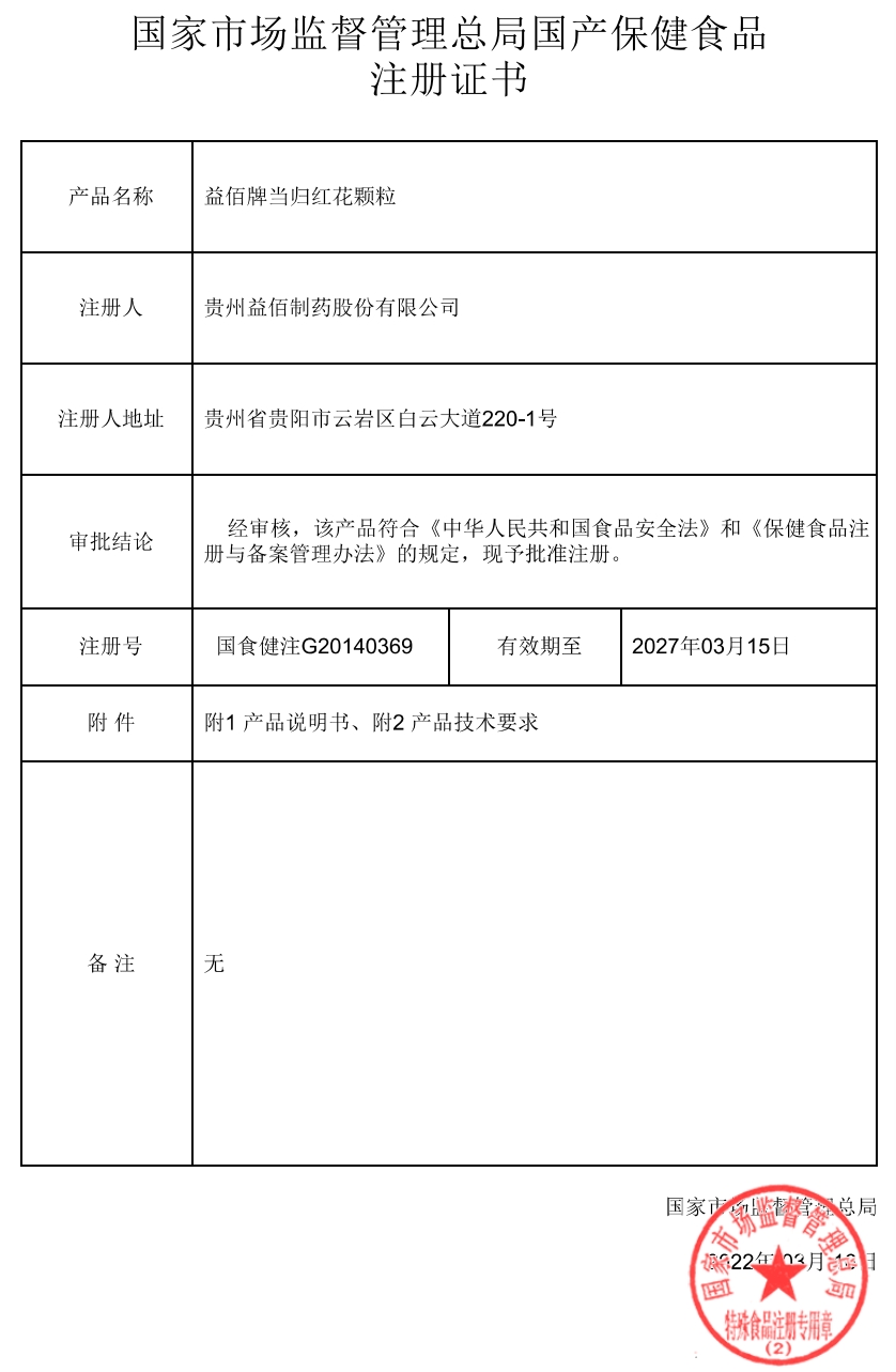 益佰牌當(dāng)歸紅花顆粒保健功能:祛黃褐斑;適宜人群:有黃褐斑者;不適宜人群:少年兒童、孕婦、乳母及月經(jīng)過(guò)多者。每日2次,每次1袋,開(kāi)水沖服。
