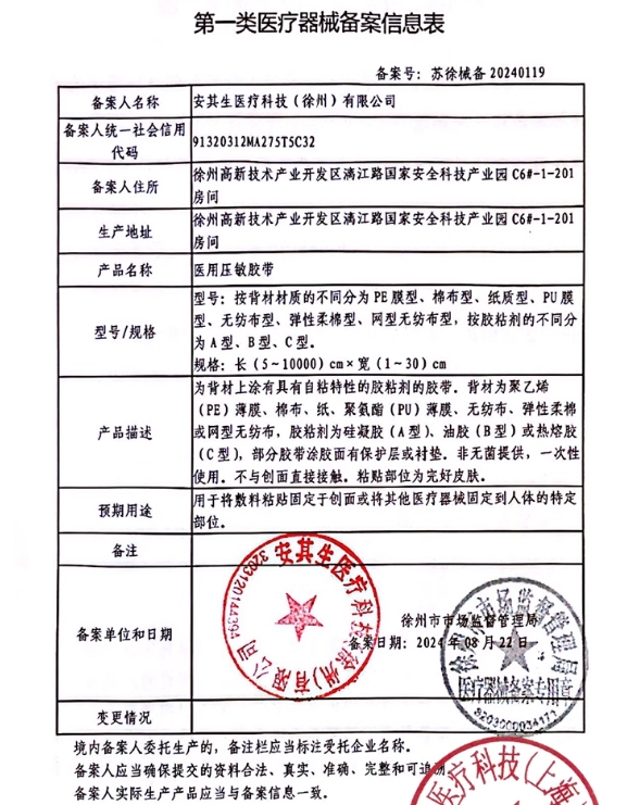 安其生醫(yī)用壓敏膠帶用于將敷料粘貼固定于創(chuàng)面或?qū)⑵渌t(yī)療器械固定到人體的特定部位。本品屬于一次性使用產(chǎn)品,不能重復(fù)使用;發(fā)霉、包裝破損、過(guò)期后嚴(yán)禁使用;過(guò)敏體質(zhì)者,請(qǐng)謹(jǐn)慎使用,如發(fā)生過(guò)敏反應(yīng),請(qǐng)立即停止使用,并咨詢(xún)醫(yī)師。