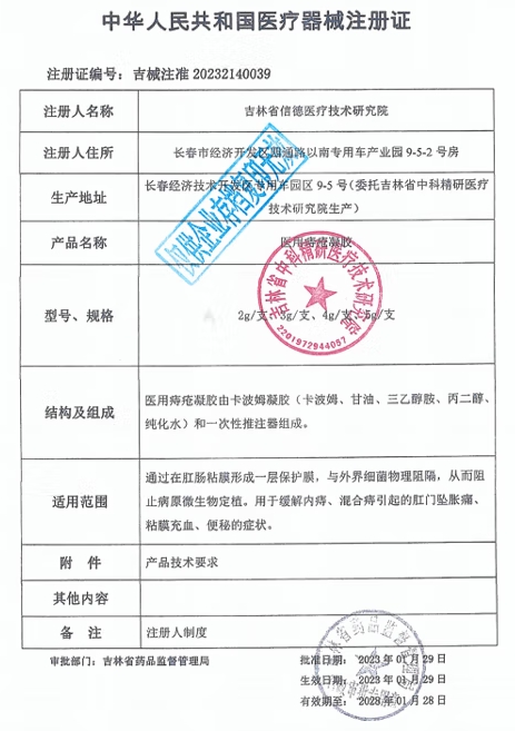 醫(yī)用痔瘡凝膠(內(nèi)廷上用/北京同仁堂)由卡波姆凝膠(卡波姆、甘油、三乙醇胺、丙二醇、純化水)和一次性推注器組成。通過在肛腸粘膜形成一層保護膜,與外界細菌物理阻隔,從而阻止病原微生物定植。用于緩解內(nèi)痔、混合痔引起的肛門墜脹痛、粘膜充血、便秘的癥狀。