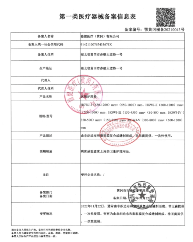 穩(wěn)健醫(yī)療醫(yī)用護理墊由非織造布和塑料膜復(fù)合或縫制而成。非無菌提供,一次性使用。病床或檢查床上用的衛(wèi)生護理用品。打開產(chǎn)品包裝即可使用。本產(chǎn)品為一次性用品,不可重復(fù)使用;本產(chǎn)品適用于成人及兒童,建議使用者每3小時更換一次或者根據(jù)實際液體吸收程度及時更換。