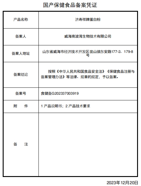 濟壽祥牌蛋白粉保健功能:有助于增強免疫力;適宜人群:因蛋白質(zhì)攝入不足而致免疫低下的成人;不適宜人群:少年兒童。每日1次,每次1袋,食用方法:溫水沖服。本品不能代替藥物。植物蛋白過敏者不宜使用;動物蛋白過敏者不宜使用。腎功能不全者慎用。孕婦、乳母建議咨詢臨床醫(yī)生、營養(yǎng)專業(yè)人員等。