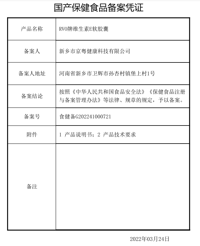 粵兒RVO牌維生素E軟膠囊保健功能:補充維生素E;適宜人群:需要補充維生素E的7-17歲人群及成人、孕婦、乳母;不適宜人群:3歲以下人群。每日1次,每次1粒,食用方法:口服。本品不能代替藥物。適宜人群外的人群不推薦食用本產(chǎn)品。不宜超過推薦量或與同類營養(yǎng)素同時食用。