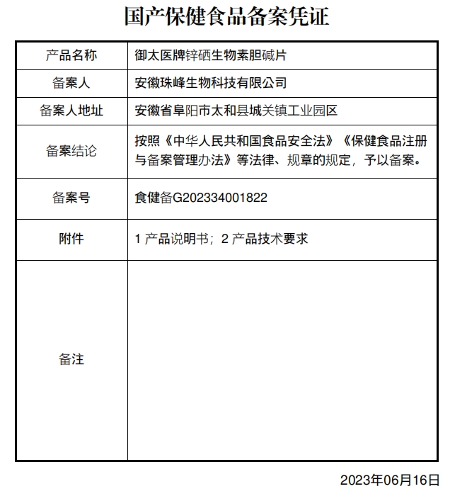 內(nèi)廷上用御太醫(yī)牌鋅硒生物素膽堿片保健功能:補(bǔ)充鋅、硒、生物素、膽堿;適宜人群:需要補(bǔ)充鋅、硒、生物素、膽堿的成人;不適宜人群:17歲以下人群及孕婦、乳母。每日1次,每次1片;食用方法:口服。本品不能代替藥物。高硒地區(qū)人群不宜食用。