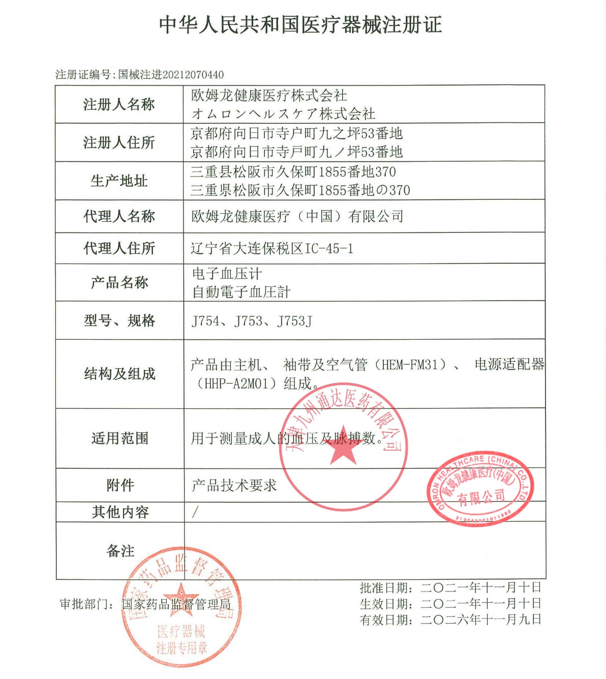 代理人名稱 歐姆龍健康醫(yī)療(中國)有限公司