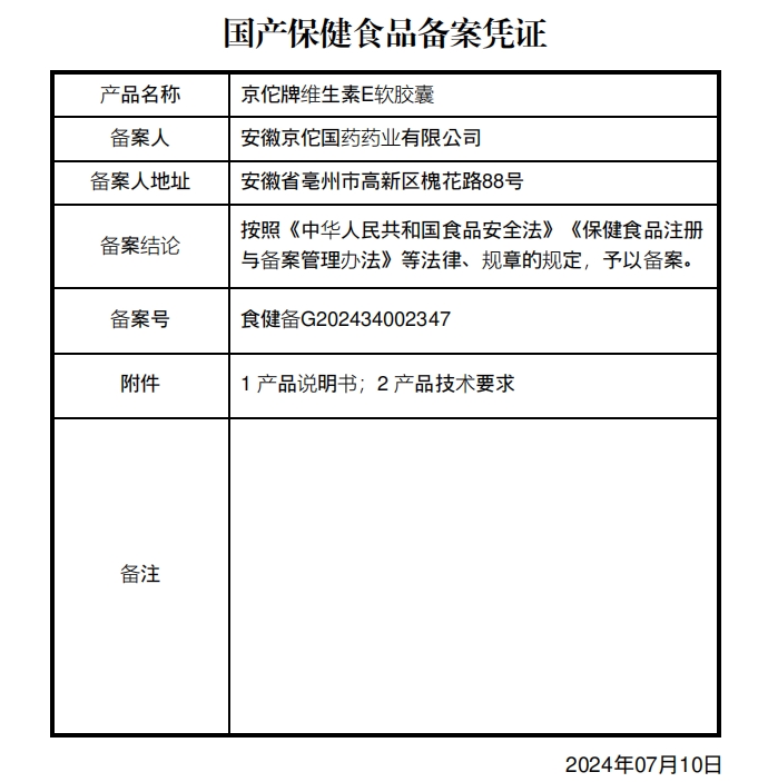 公和堂京佗牌維生素E軟膠囊保健功能:補(bǔ)充維生素E;適宜人群:需要補(bǔ)充維生素E的成人;不適宜人群:10歲以下人群及孕婦、乳母。每日1次,每次1粒,食用方法:口服。本品不能代替藥物。適宜人群外的人群不推薦食用本產(chǎn)品。不宜超過推薦量或與同類營(yíng)養(yǎng)素同時(shí)食用。
