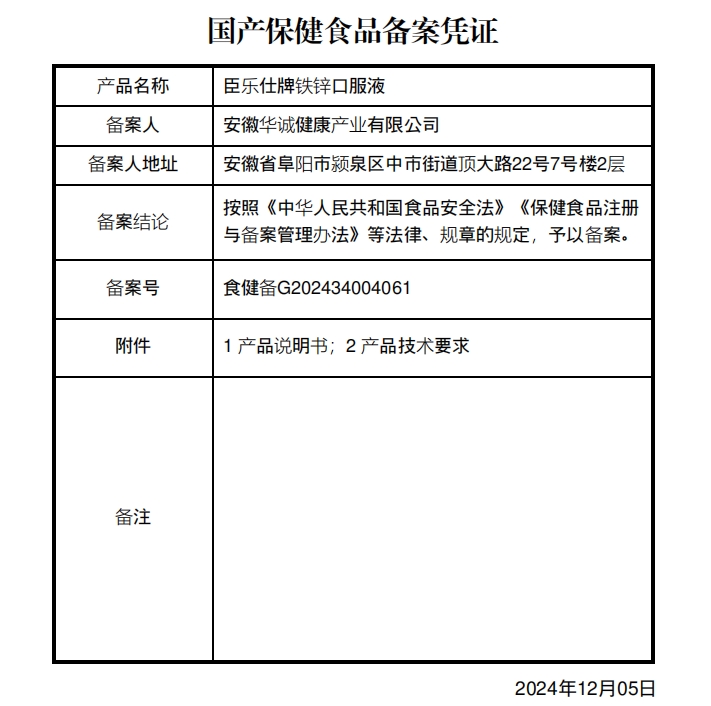 臣樂仕牌鐵鋅口服液保健功能:補充鐵、鋅;適宜人群:需要補充鐵、鋅的4-17歲人群及成人、孕婦、乳母;不適宜人群:3歲以下人群。4-10歲:每日1次,每次1支;11-17歲:每日2次,每次1支;成人、孕婦、乳母:每日2次,每次1支;食用方法:口服。本品不能代替藥物。