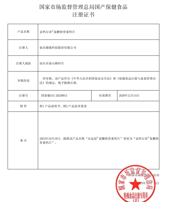 金鈣爾奇氨糖軟骨素鈣片保健功能:本品經動物實驗評價,具有有助于改善骨密度的保健功能;適宜人群:中老年人;不適宜人群:少年兒童、孕婦、乳母。每日2次,每次2片,口服。本品不能代替藥物;本品添加了營養(yǎng)素,與同類營養(yǎng)素同時食用不宜超過推薦量。