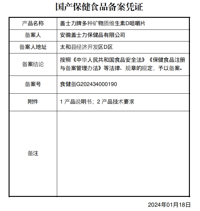 蓋士力牌多種礦物質(zhì)維生素D咀嚼片保健功能:補(bǔ)充多種礦物質(zhì)、維生素D;適宜人群:需要補(bǔ)充多種礦物質(zhì)、維生素D的成人;不適宜人群:17歲以下人群及孕婦、乳母。每日1次,每次2片,食用方法:咀嚼食用。本品不能代替藥物。