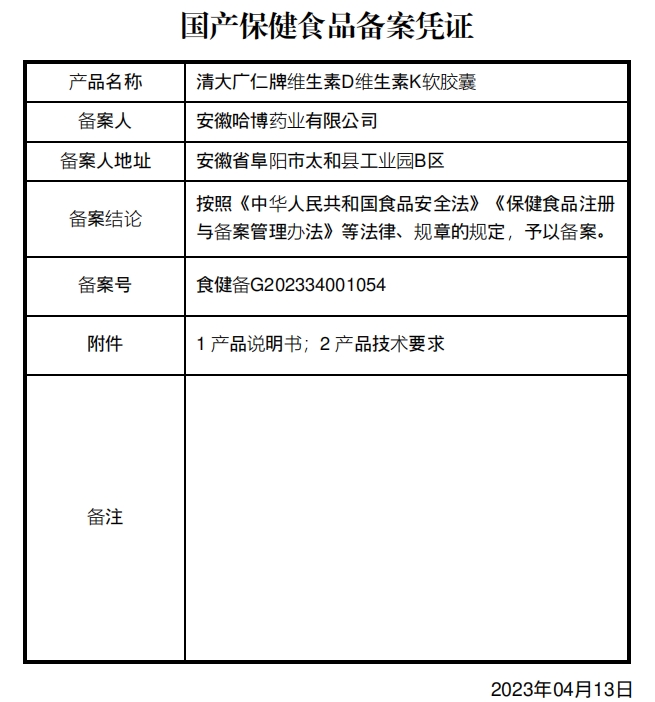 HBLY清大廣仁牌維生素D維生素K軟膠囊保健功能:補充維生素D、維生素K、維生素E;適宜人群:需要補充維生素D、維生素K的4-17歲人群及成人;不適宜人群:3歲以下人群及孕婦、乳母。每日2次,每次1粒;食用方法:口服。本品不能代替藥物。適宜人群外的人群不推薦食用本產(chǎn)品。
