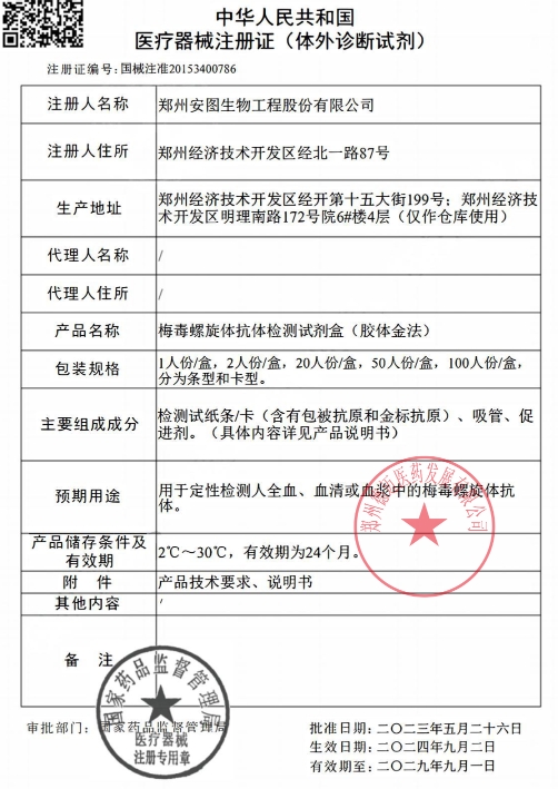 安圖生物梅毒螺旋體抗體檢測試劑盒(膠體金法)由檢測試紙條/卡(含有包被抗原和金標(biāo)抗原)、吸管、促進(jìn)劑組成。用于定性檢測人全血、血清或血漿中的梅毒螺旋體抗體。本產(chǎn)品僅用于體外診斷,為一次性使用產(chǎn)品,使用后的不可回收再次利用。