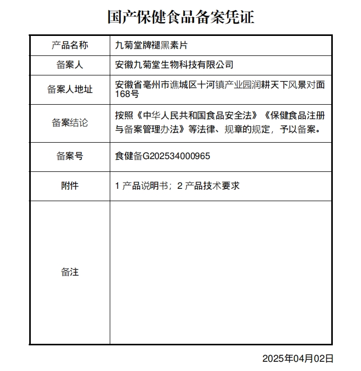 九菊堂牌褪黑素片保健功能:有助于改善睡眠;適宜人群:成人;不適宜人群:少年兒童、孕婦、乳母。每日1次,每次1片,食用方法:口服。本品不能代替藥物。從事駕駛、機(jī)械作業(yè)或危險(xiǎn)操作者,不要在操作前或操作中食用。自身免疫癥(類風(fēng)濕等)及甲亢患者慎用。