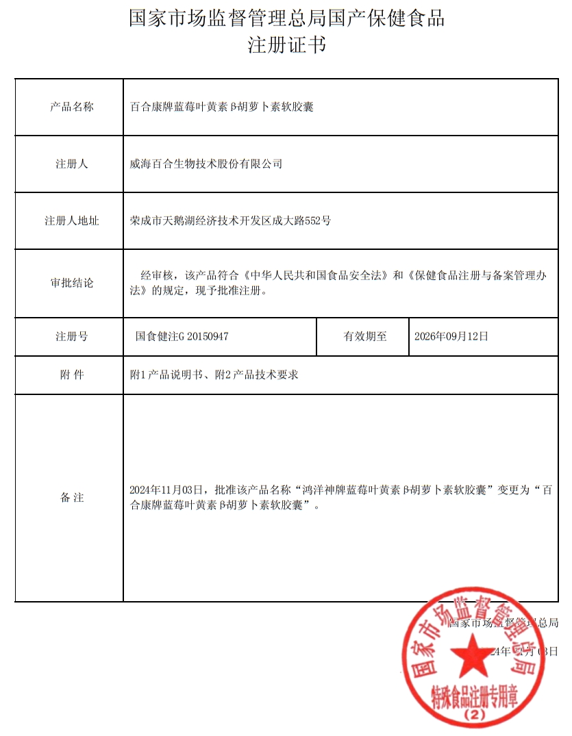六和乾坤百合康牌藍莓葉黃素β-胡蘿卜素軟膠囊保健功能:緩解視疲勞;適宜人群:視力易疲勞者;不適宜人群:嬰幼兒、孕婦、乳母。每日2次,每次1粒,口服。本品不能代替藥物;適宜人群外的人群不推薦食用本產品。