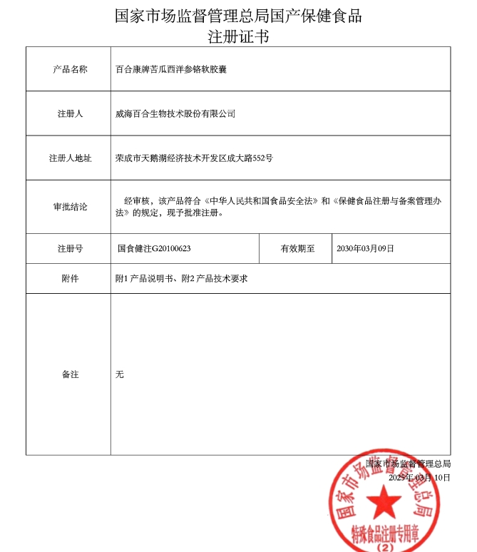 寶樂萊康百合康牌苦瓜西洋參鉻軟膠囊保健功能:有助于維持血糖健康水平;適宜人群:血糖偏高者;不適宜人群:少年兒童、孕婦、乳母。每日2次,每次2粒,口服。本品不能代替藥物;本品添加了營養(yǎng)素,與同類營養(yǎng)素同時食用不宜超過推薦量。本品生產(chǎn)過程有輻照。