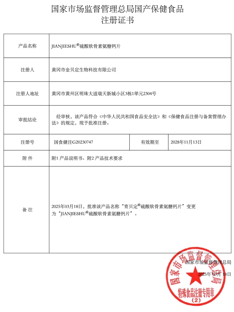 黃金搭檔JIANJIESHU硫酸軟骨素氨糖鈣片保健功能:本品經(jīng)動(dòng)物實(shí)驗(yàn)評(píng)價(jià),具有有助于改善骨密度的保健功能;適宜人群:中老年人;不適宜人群:少年兒童、孕婦、乳母。每日1次,每次4片,口服。本品不能代替藥物。適宜人群外的人群不推薦食用本產(chǎn)品。