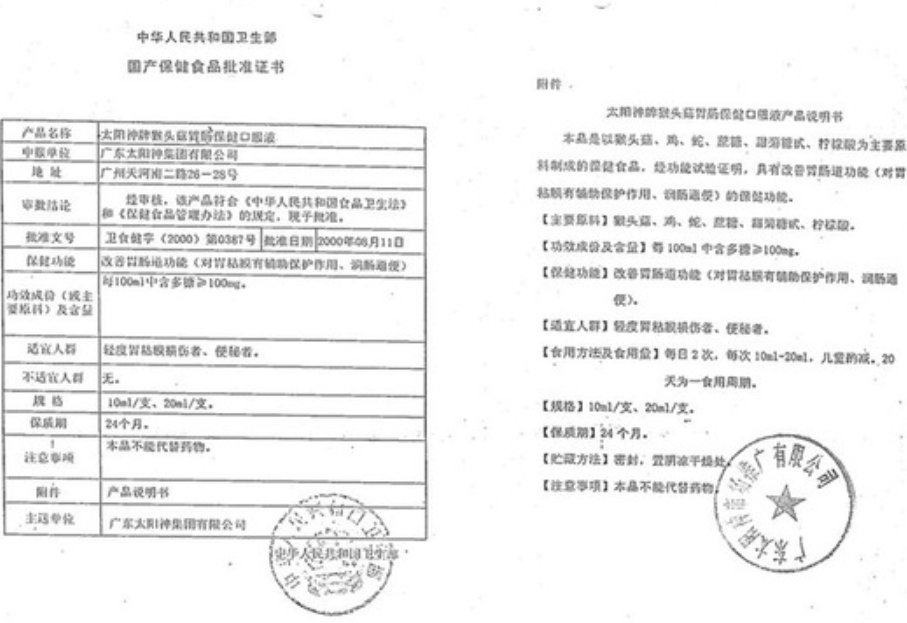 太陽(yáng)神牌猴頭菇胃腸保健口服液保健功能:改善胃腸道功能(對(duì)胃粘膜有輔助保護(hù)作用、潤(rùn)腸通便);適宜人群:輕度胃黏膜損傷者、便秘者;不適宜人群:無(wú)。每日兩次,每次10ml-20ml,兒童酌減。20天為一個(gè)食用周期。主要成份為猴頭菇、雞、蛇、蔗糖、甜菊糖苷、檸檬酸。每100ml中含多糖≥100mg。